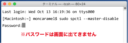 ※設定を元に戻すときは、「ターミナル」で sudo spctl --master-enable と入力して下さい。